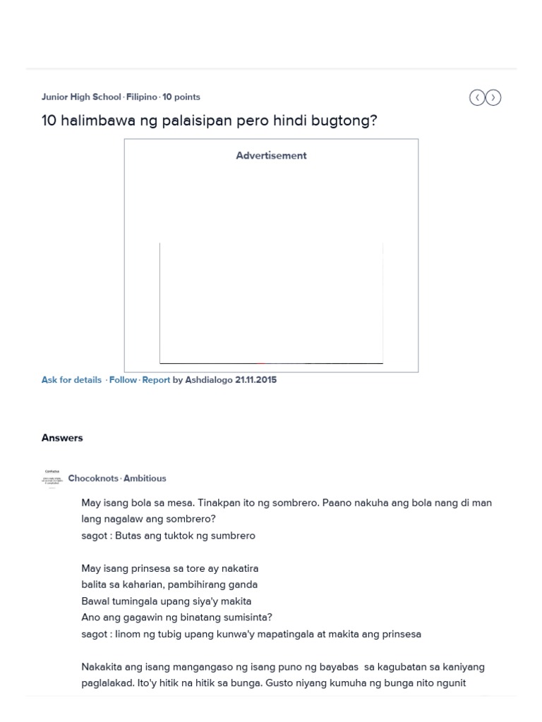 Brainly Ph User Ashleyjoycreencia Asks 10 Halimbawa Ng Palaisipan Pero Hindi Bugtong Tignan Ang Mga Sagot At Subukan Niyong Sagutin Ang Mga Palaisipan Doon Http Brainly Ph Question 85173 Facebook