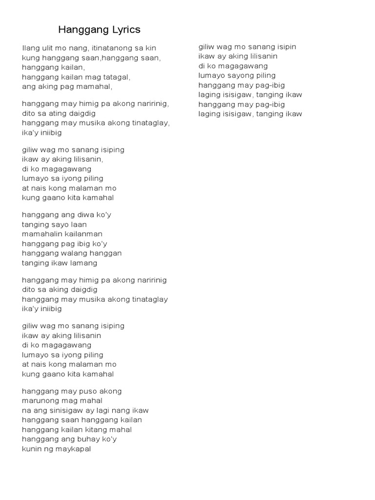 Ikaw ay aking lilisanin. Giliw wag mo sanang isiping Ikaw ay aking lilisanin Di ko magagawang Lumayo sayong piling At nais kong malaman mo Kung gaano kita kamahal Hanggang may puso akong Marunong mag mahal Na ang sinisigaw ay lagi ng ikaw Hanggang saan hanggang kailan Hanggang kailan kita mahal Hanggang ang buhay koy Kunin ng may kapal Giliw wag mo sanang isipin Ikaw ay aking lilisanin. -Wilfred Manahan 051606 HANGGANG by.