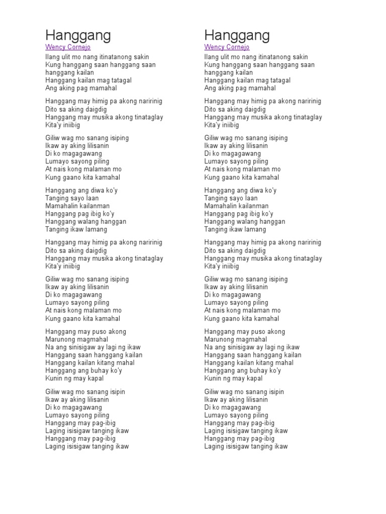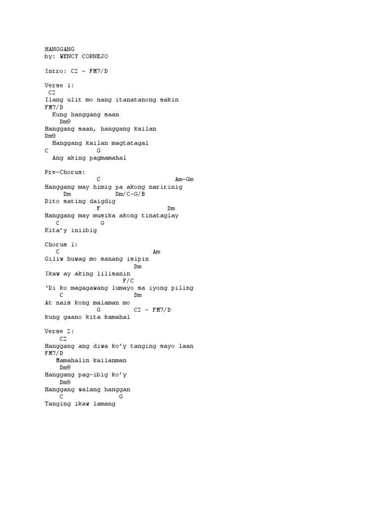 D Bm A7 D D Huwag mo sanang isiping Em Di Kita natatanaw A Huwag mo sanang isipin Em D D Fm Bm Iniwanan na Kita Bm Lagi kang nakikita Fm Sa paglipas ng araw G Em At Aking nalalaman A Asus A Ang iyong pagdurusa D Huwag mo sanang isipin Em hindi Kita naririnig A Ang iyong dalamhati Em D D Fm Bm Ang iyong mga daing Bm Di mo ba nalalaman. WENCY CORNEJO Intro C2 FM7 D Verse C2 Ilang ulit mo nang itanatanong sakin FM7 D Kung hanggang saan Dm9 Hanggang saan hanggang kailan Dm9 Hanggang kailan magtatagal C G Ang aking pagmamahal Pre-Chorus C Am-Gm Hanggang may himig pa akong naririnig Dm DmC-GB Dito sating daigdig F Dm Hanggang.