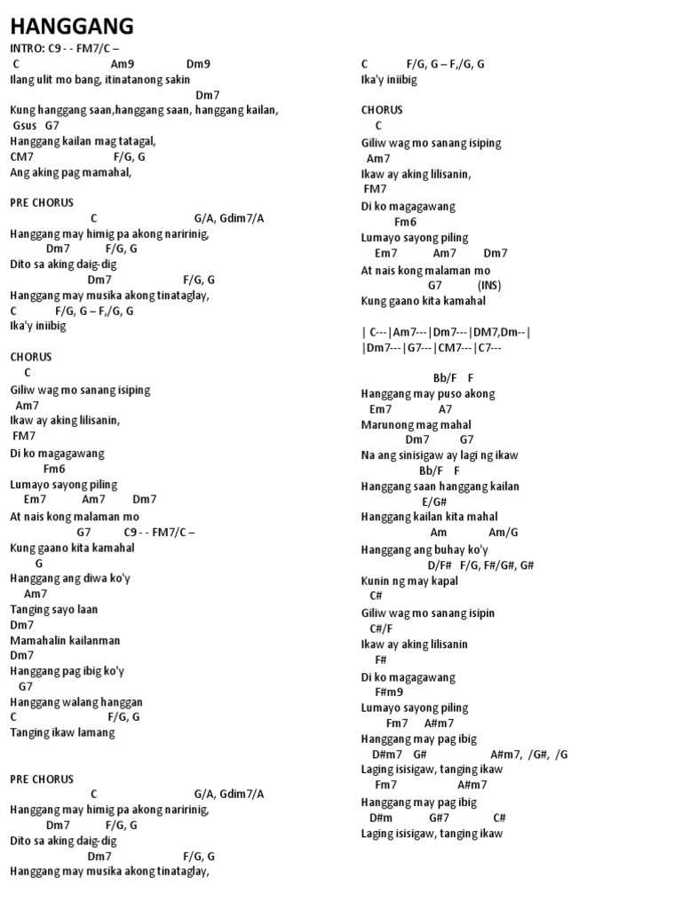 Giliw wag mo sanang isiping. C2 Ilang ulit mo nang itanatanong sakin FM7 D Kung hanggang saan Dm9 Hanggang saan hanggang kailan Dm9 Hanggang kailan magtatagal C G Ang aking pagmamahal Pre-Chorus. C Am-Gm Hanggang may himig pa akong naririnig Dm DmC-GB Dito sating daigdig F Dm Hanggang.