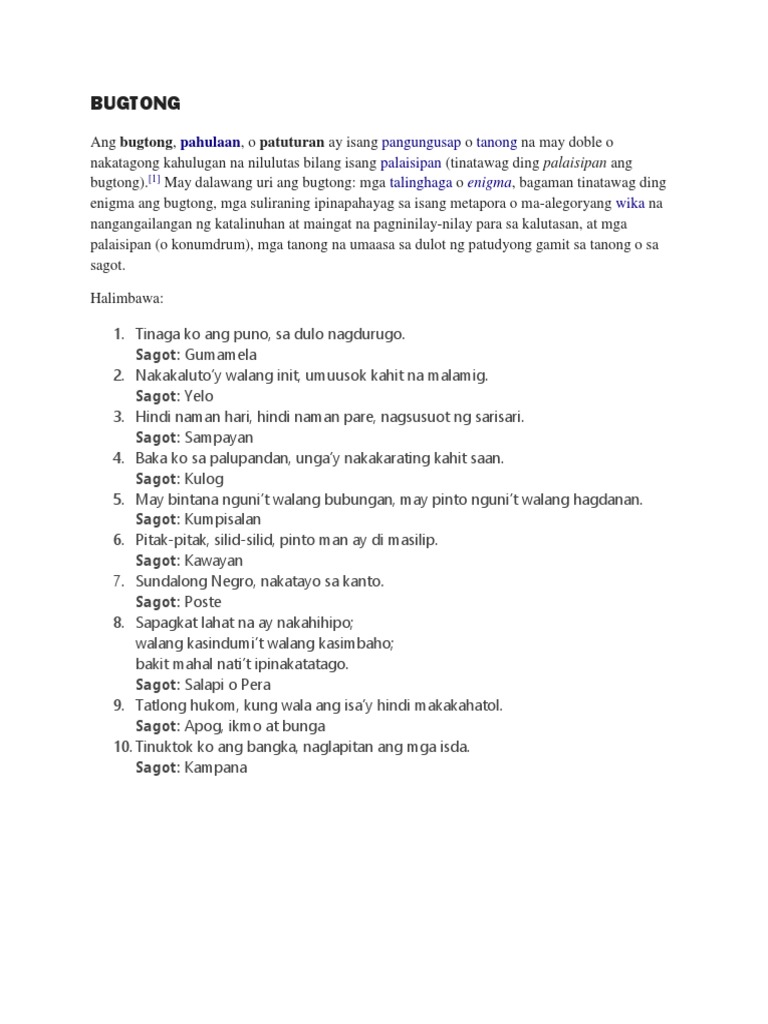 BUGTONG BUGTONG Narito ang mahigit sa dalawampung 20 halimbawa ng mga palaisipan. Bugtong 793 Itim na tinta ang panulat Ng milyong kamay na kagulat-gu. Kilala rin bilang bugtong pahulaan o patuturan ito ay isang tanong o pangungusap na may iba o nakatagong kahulugan na kailangang lutasin o hulaan.