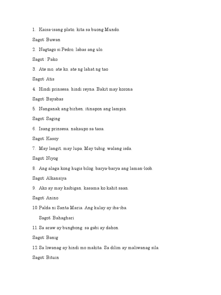 Bugtong uLoL1-20 levelsI actually got it all right. Makatang Pinoy Mga Bugtong At Halimbawa. Mga Bugtong at Sagot - S Hindi hayop hindi tao nagsusuot ng sumbrero.